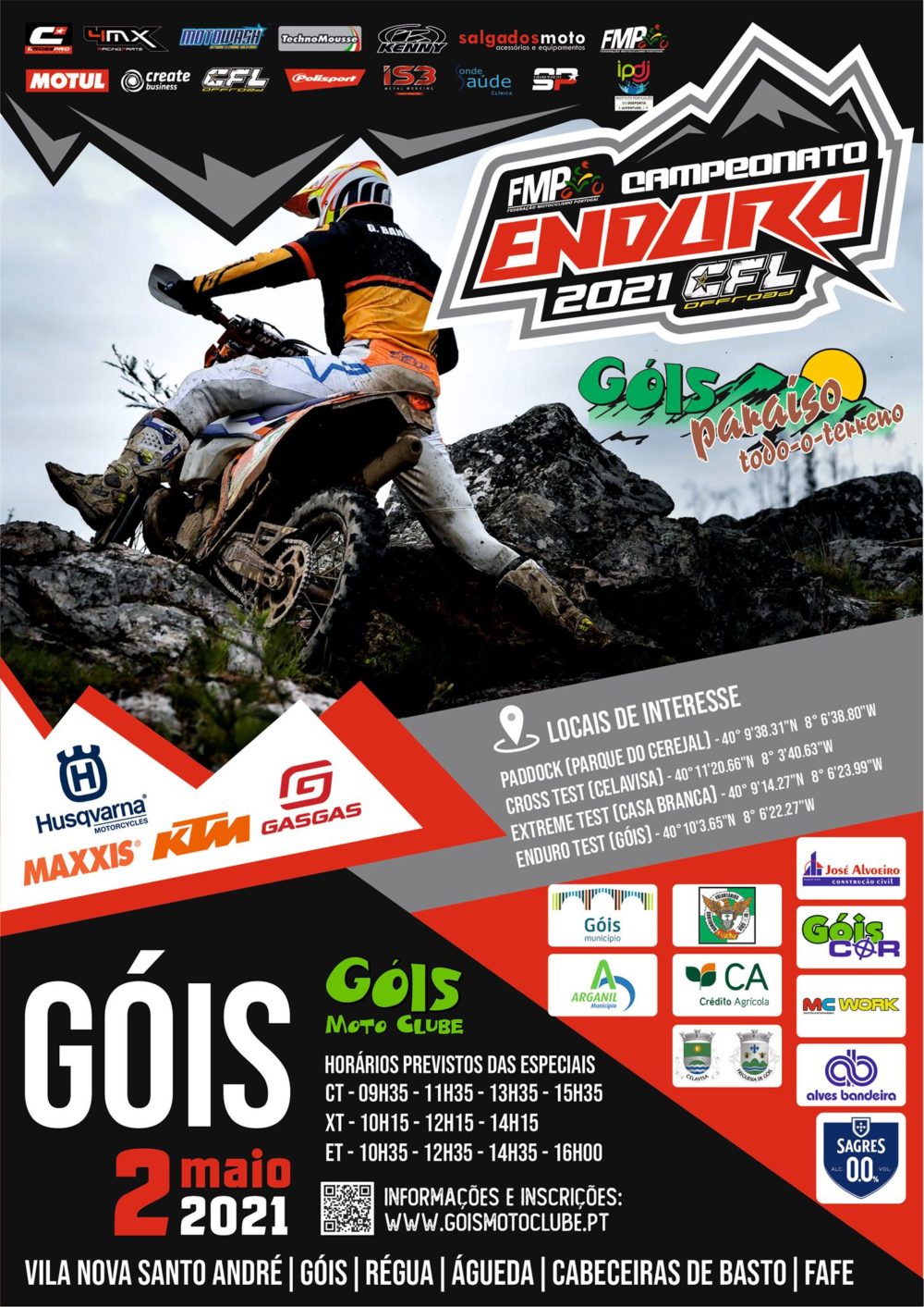 Provas especiais serão três, como é hábito no formato do CNE, situando-se a Cross-Test (em terreno misto com pequenos relevos e quatro quilómetros de extensão) na Aldeia de Celavisa, a Enduro Test (a cerca de 800 metros do paddock, em terreno misto e com 5 quilómetros de extensão) junto a Góis, na N342 em direção a Arganil e a Extreme Test (a 1,5 km da ZA, na maior parte natural aproveitando o relevo do terreno) na Casa Branca, sendo devidamente sinalizado o trajecto até às mesmas.