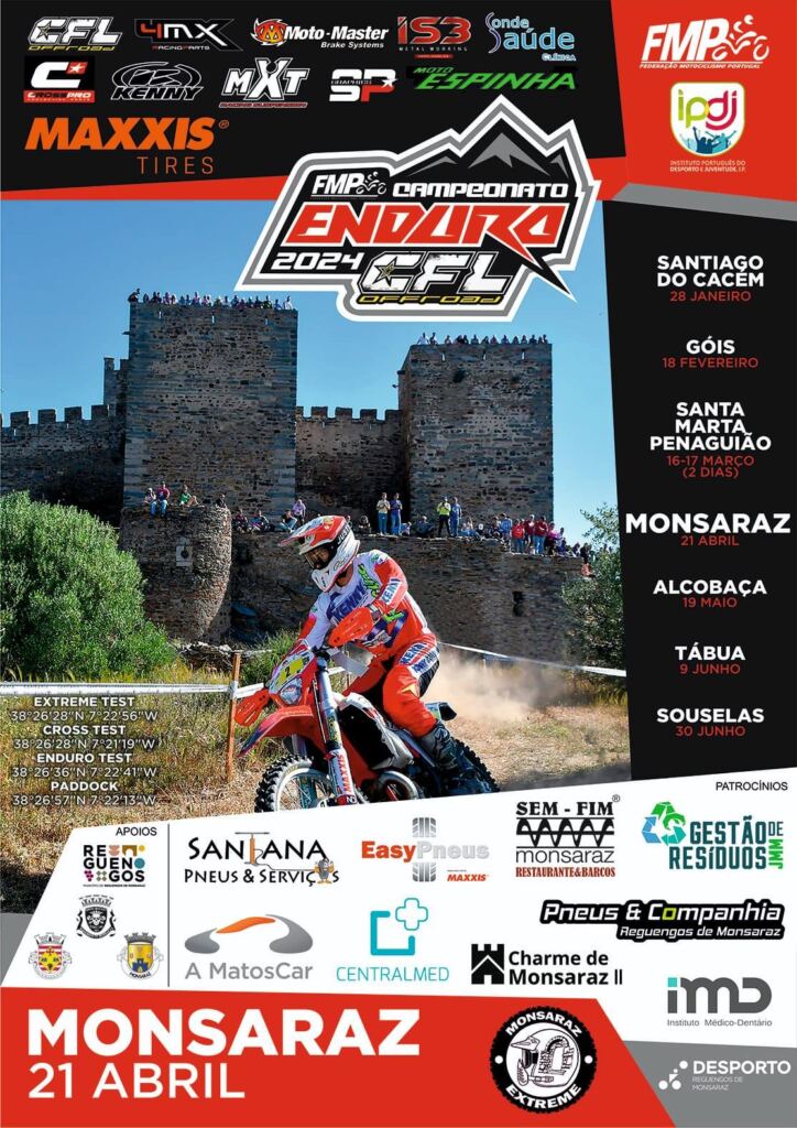 A quarta ronda do Campeonato Nacional de Enduro – CFL 2024 estará a cargo da Associação Clube Desportivo Monsaraz Extreme e aproveita o belo Castelo de Monsaraz – que hoje em dia conta com uma magnífica vista sobre a barragem do Alqueva -, onde estará instalado o parque fechado e que, à sombra das suas muralhas, verá disputar-se a especial Extreme Test. O percurso de 44 km, incluindo as especiais Extreme Test, Cross Test e Enduro Test, cruza trialeiras e trilhos sinuosos banhados pela albufeira do Alqueva, sendo percorrido três vezes e meia pelos pilotos Elite e Open, três vezes pelos Verdes, Veteranos e Senhoras, e duas vezes pelas restantes classes. O primeiro piloto sairá para o percurso às 9h00.