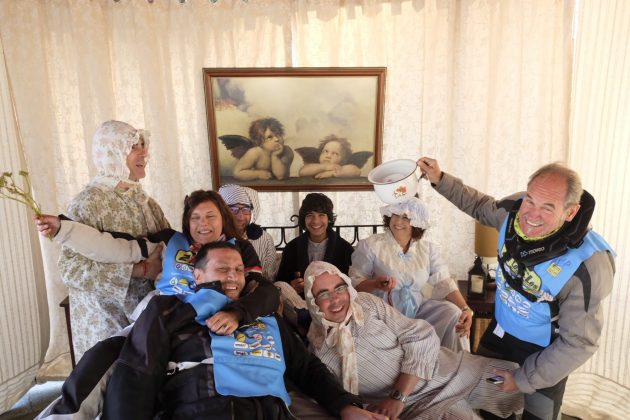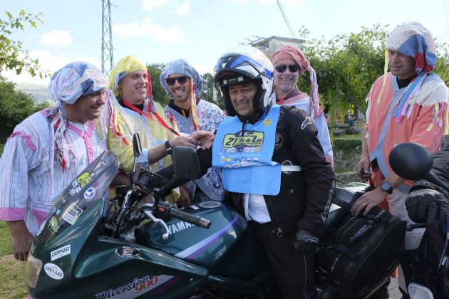 Da Capital do Calçado rumou a norte a enorme caravana internacional, aproveitando as paragens no santuário de São Torcato, no castelo de Póvoa de Lanhoso ou na praia fluvial de Adaúfe, para comer o primeiro de vários reforços ao pequeno-almoço entregue pela organização em Felgueiras. Momentos para digerir – além de requintada lista de doçaria, sanduíches, sumos, enchidos, café, e muitas outras ao nivel de hotel de 5 estrelas – as primeiras emoções de uma viagem sempre ladeada por paisagens verdejantes, da descida ao Rio Vizela à sinuosa subida a Guimarães. Mas passando ao lado da histórica cidade em direcção a S. Torcato e ao enorme templo cuja demora na construção justifica a profusão de estilos, do neoclássico, gótico, renascentista e romântico. Espaço onde o MC Conquistadores de Guimarães montou espectacular controlo de passagem, superando mesmo o elevado nível da produção apresentada em 2018 no castelo de Montalegre. Depois da uma boa mão-cheia de agradáveis curvinhas, a primeira grande surpresa do dia levou muitos participantes a esfregar os olhos de espanto, tal era o ‘teatro’ armado pelos Conquistadores. Estariam bem acordados? Um controlo que, sem exagero e antes a pecar por defeito, fica na história do Lés-a-Lés, com príncipes e princesas, serviçais e feirantes, ciganos e bispos, emigrantes preparados para fugir ‘a salto’ da miséria que grassava em Portugal na década de 1960, um quarto de dormir decorado a preceito segundo os cânones de outros tempos, com toda a família em pijama e até o penico. E sem esquecer o temível Zé do Telhado que, armado de imponente pistolão, ditava leis para um estacionamento perfeito das muitas motos que ali se acumularam.