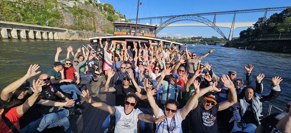 Jogo de tirar o fôlego (tal era o estado do dobrado e esburacado tubo…) que, logo ali, podia ser reposto respirando uns minutos enquanto se bebia uma água ou sumos, acompanhados por uns deliciosos pastéis de feijão, antes mesmo de sentir na pele, literalmente, os ventos que ajudavam os rabelos a vencer a distância desde a Régua, de onde partiam carregados de pipas de vinho. E assim, num barco que desses tempos guardou a inspiração estética, viveu-se um dos pontos altos deste primeiro dia do Moto Rali do MCP: uma viagem pelo Douro, permitindo apreciar o Porto de um ângulo único, que só o rio oferece. Os reflexos da policromia da zona ribeirinha refletida nas águas, a vista das pontes que marcam o perfil da cidade e evocam histórias centenárias de crescimento e desenvolvimento, ou o charme das caves de vinho revelam uma beleza autêntica que torna estes momentos verdadeiramente inesquecíveis. Como inesquecível será o ‘sunset’ que, sem estar no programa, reuniu os participantes de forma espontânea num local quase secreto, longe da confusão de um dos mais concorridos sítios da região na hora em que o sol baixa do horizonte atlântico, deixando a cidade banhada em cores únicas, reflexos de um calor humano sem paralelo.