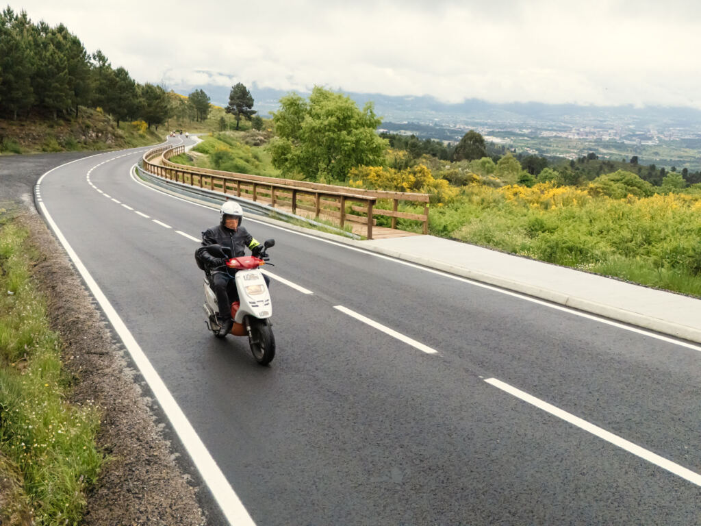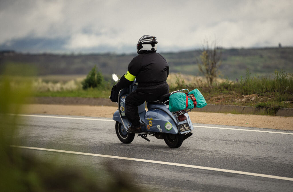 Estrada mais ‘macia’ para o sofrimento da BMW R26 (1959) de João Paulo Dias, com o quadro partido na véspera fixo por reparação de fortuna, com um sistema “feito a partir de peças metálicas existentes em qualquer casa de ferragens” e que surpreenderia qualquer engenheiro. No entanto, a boa disposição, do condutor e de todos os amigos do grupo, continuou intacta, tal como a de Vasco Barbosa que voltou a contar com o sidecar da Vespa 150 Sprint V que tivera de desmontar na véspera com problemas mecânicos, fazendo o resto da etapa apenas em duas rodas.