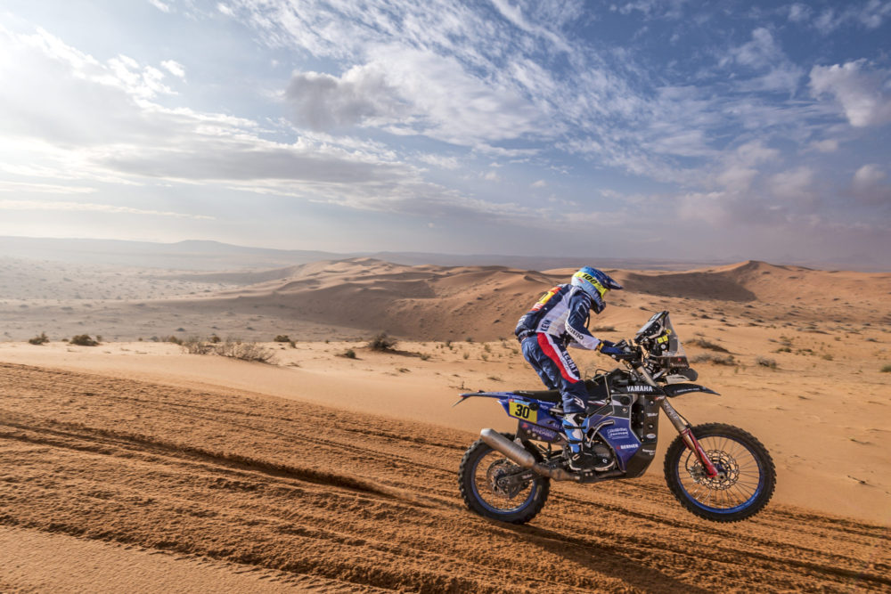 ‘A etapa de hoje foi só areia, só fora de pista e não era um percurso ao meu jeito. Muita ‘bossa de camelo’, nada de dunas grandes, apenas aquela areia mole, chata, com ‘ervinhas’. O início foi tranquilo, mas ao quilómetro 8 havia uma vala de perigo 2. Saltei, mas o impacto foi um pouco mais forte e ‘disparou’ o airbag. Acabou por esvaziar, mas tive de ir com mais cautela e fiquei um pouco desorientado. Ainda antes da neutralização onde pude trocar o ‘airbag’, perdi muito tempo numa trialeira com pedras e areia, foi complicado pois a moto enterrava-se e já não sabia o que fazer. Ter perna curta é o que dá. Na parte final já consegui meter um ritmo em que me senti confortável, já estava também mais habituado ao tipo de terreno. A navegação correu bem, foi tranquila, não tive grandes problemas, mas a corrida está mais exigente este ano relativamente aos anteriores o que pode ser bom para mim. A moto está impecável e o Bruno continua a tratar bem dela.’ relatou António Maio no bivouac em Hail.