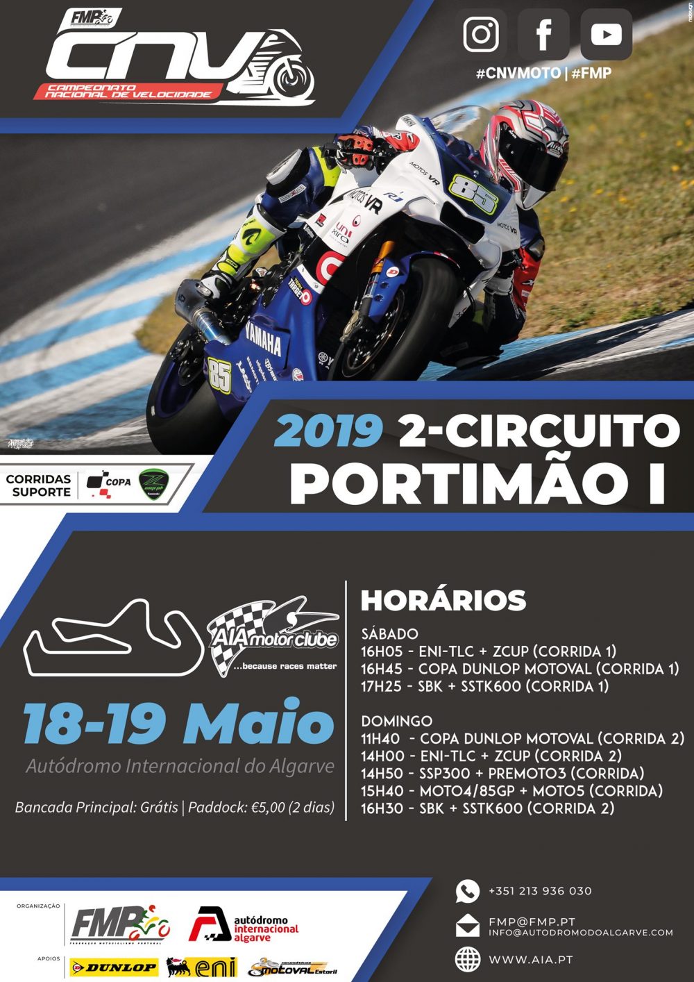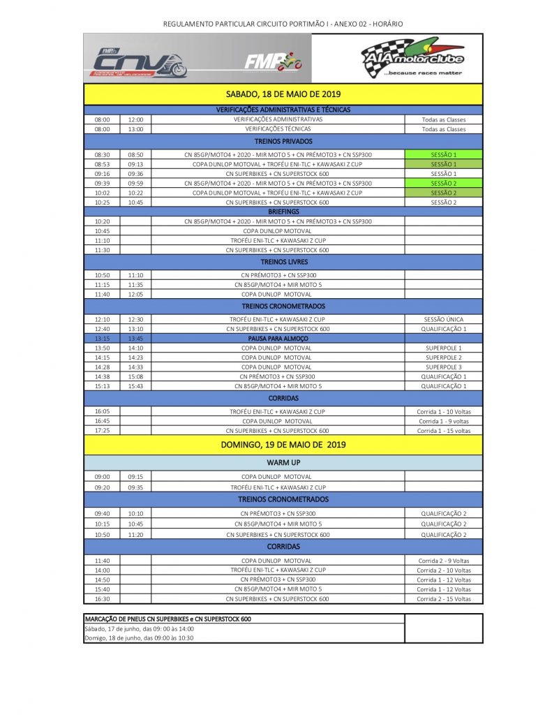 Tal como na primeira ronda o programa de corridas volta a dividir-se por ambos os dias, o final da tarde de Sábado está reservado á realização de três das oito corridas em agenda sendo que a durante a manhã se realizarão treinos privados e as sessões livres e cronometradas. O Domingo está reservado para mais cinco corridas e qualificações num programa que promete mais uma vez ser bem animado e com excelentes lutas em pista em todas as categorias que vão utilizar os exigentes 4592 metros do circuito que ganhou a alcunha de ‘montanha russa’ com as suas subidas e descidas. A bancada principal do circuito junto á cidade de Portimão tem acesso gratuito ao longo de ambos os dias, sendo que o acesso ao paddock terá um custo de 5 euros (2 dias).